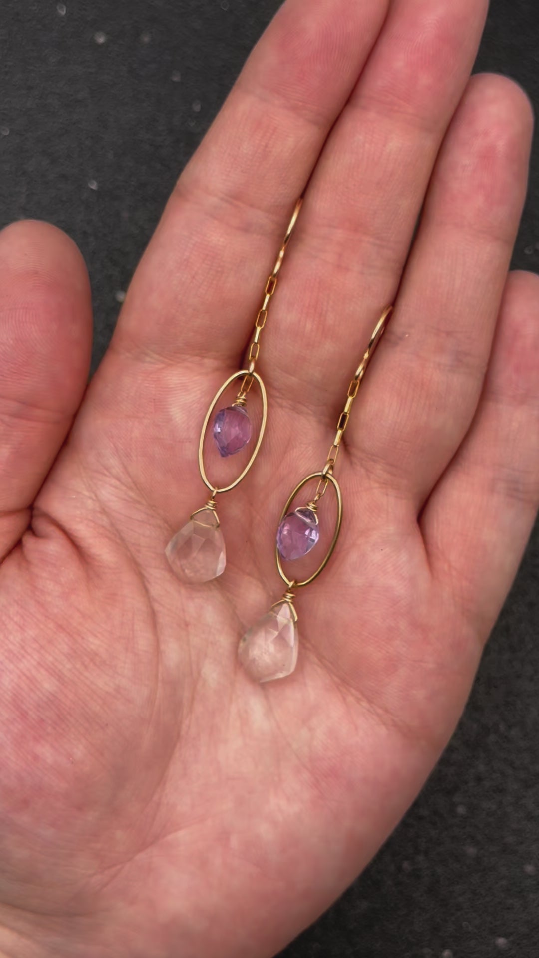 •LUNA SWING• rose quartz + amethyst gold dangle earrings