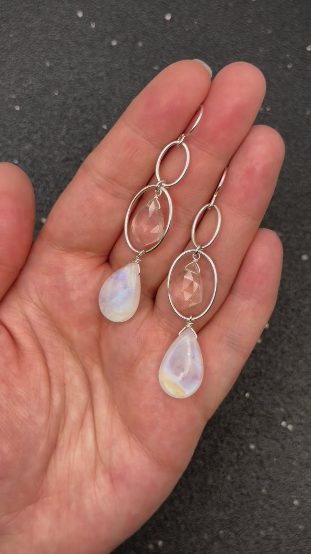 •DOUBLE LUNA• rainbow moonstone + rose quartz silver dangle earrings
